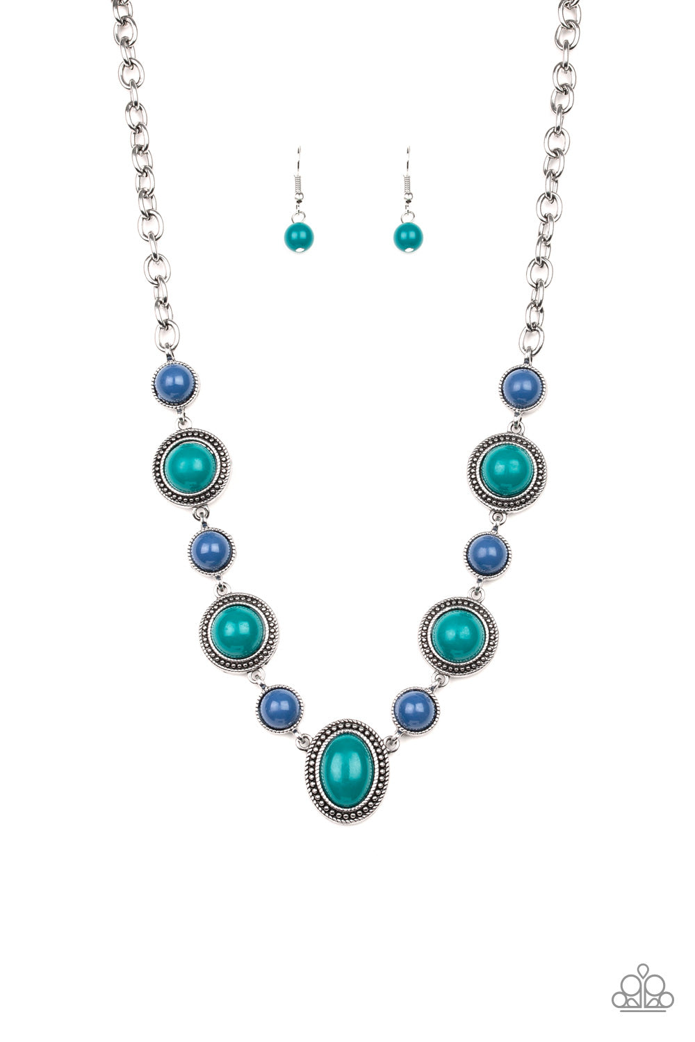 Featuring smooth and studded silver frames, refreshing blue and green beads link below the collar in a seasonal fashion. Features an adjustable clasp closure.