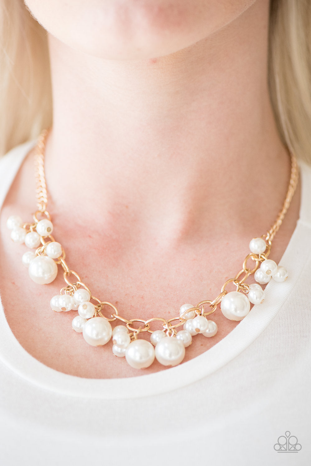 Clusters of large and small white pearls cascade from the bottom of bold gold chain, creating a refined fringe below the collar. Features an adjustable clasp closure.