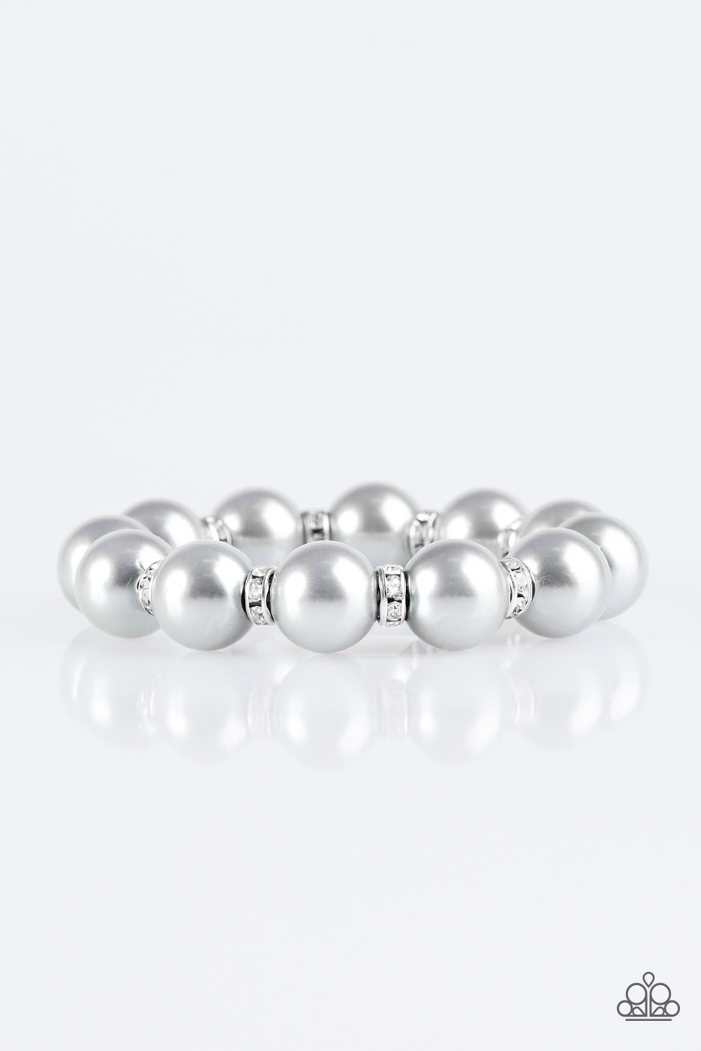 Encrusted in glittery white rhinestones, dainty silver rings and pearly silver beads are threaded along an elastic stretchy band for a timeless look.