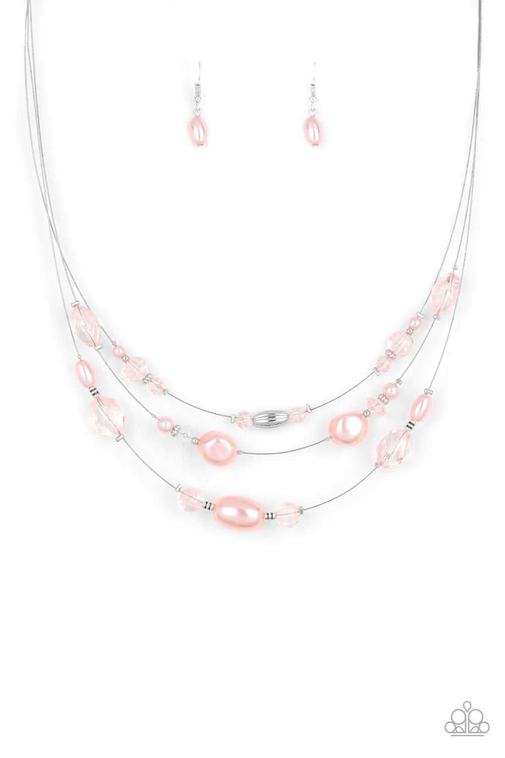 An elegant collection of pearly pink, dainty silver, and pink crystal-like beads are fitted in place along three silver wires below the collar, creating the illusion of floating layers. Features an adjustable clasp closure.