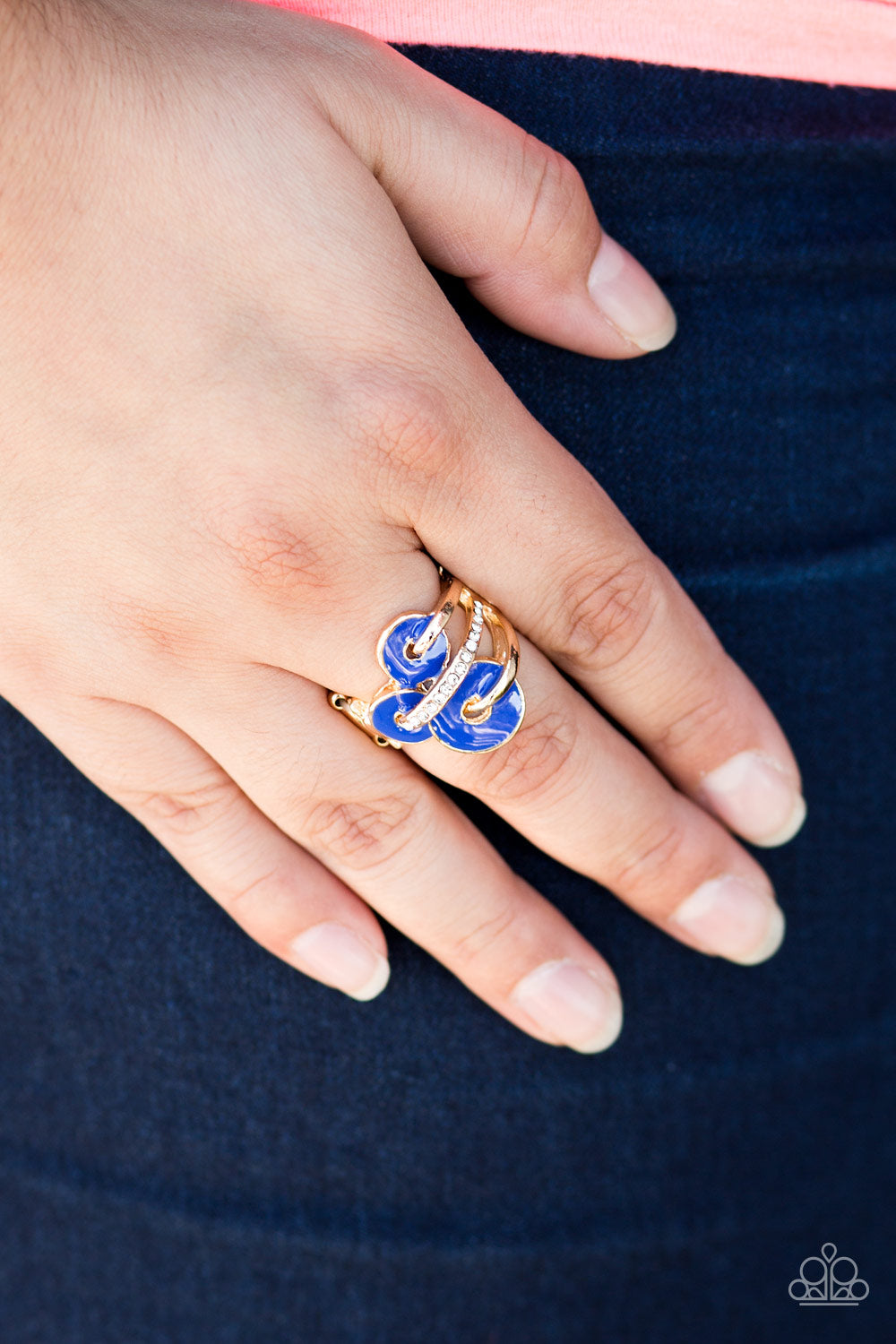Glistening gold bands are threaded through the centers of shiny blue accents, creating a colorful frame. Glittery white rhinestones are sprinkled across the centermost band for a refined finish. Features a stretchy band for a flexible fit.