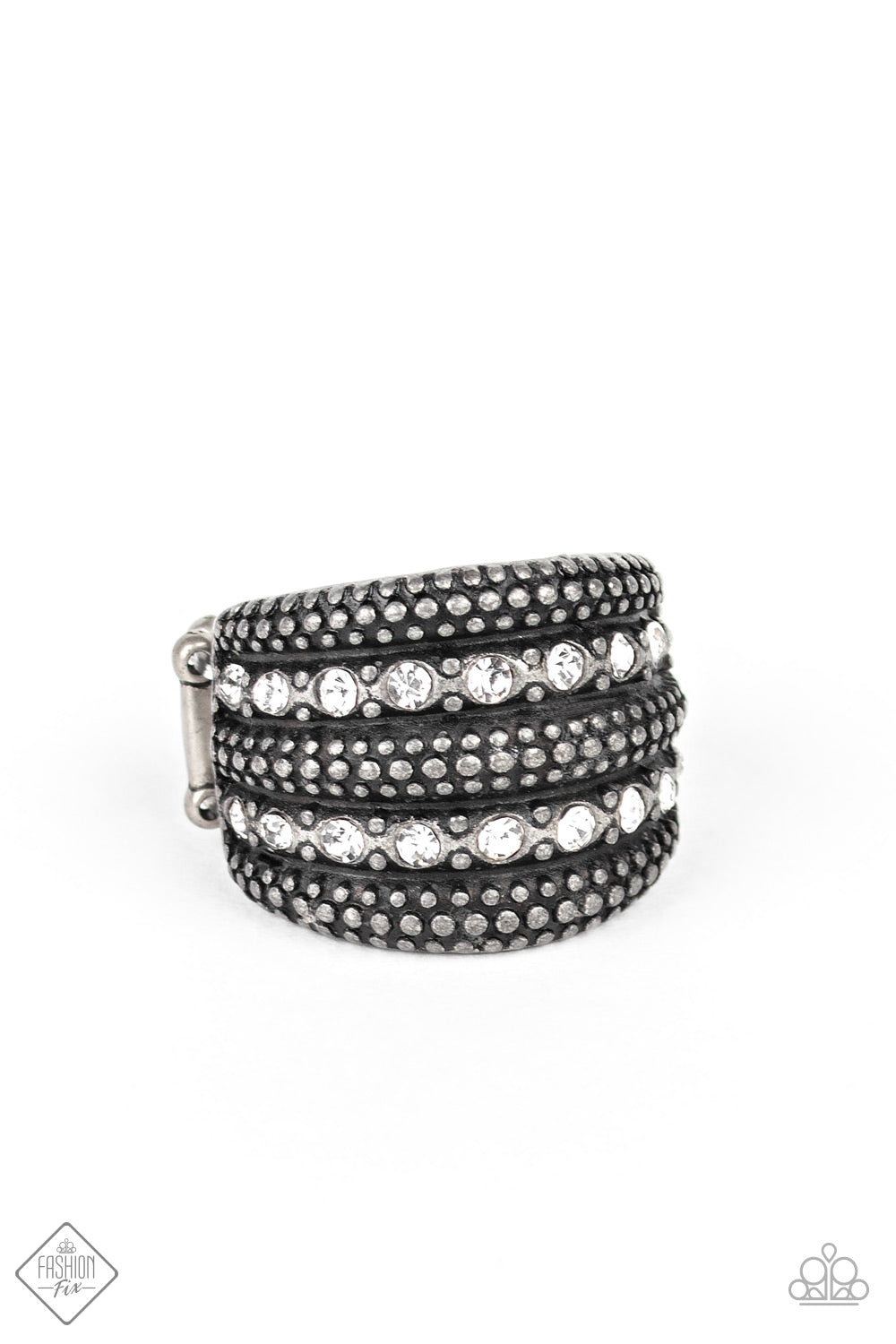 Two rows of glassy white rhinestones are encrusted along a thick, tin-finished silver band radiating in sections of antiqued studs for an edgy look. Features a stretchy band for a flexible fit.