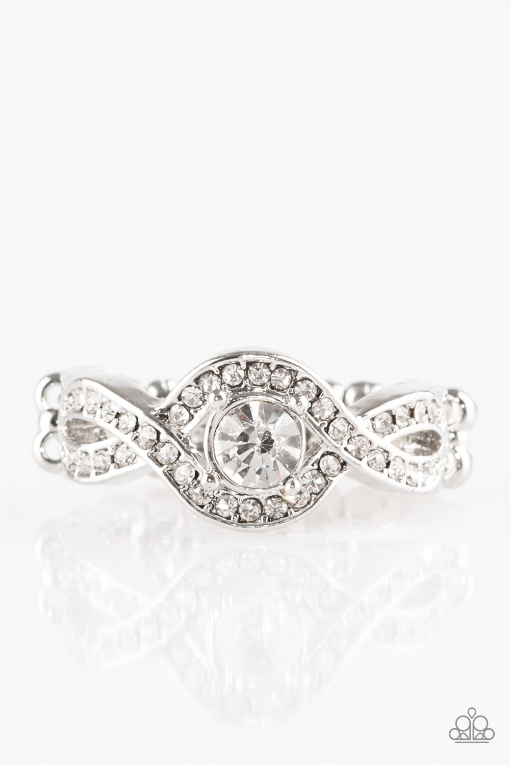 Encrusted in glassy white rhinestones, shimmery silver bands loop around a glittery white rhinestone center for a refined look. Features a dainty stretchy band for a flexible fit.