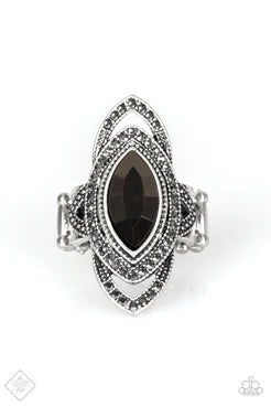 Featuring a regal marquise style cut, a glittery silver gem is pressed into the center of stacked silver frames radiating with glittery hematite rhinestones for a glamorous finish. Features a stretchy band for a flexible fit.