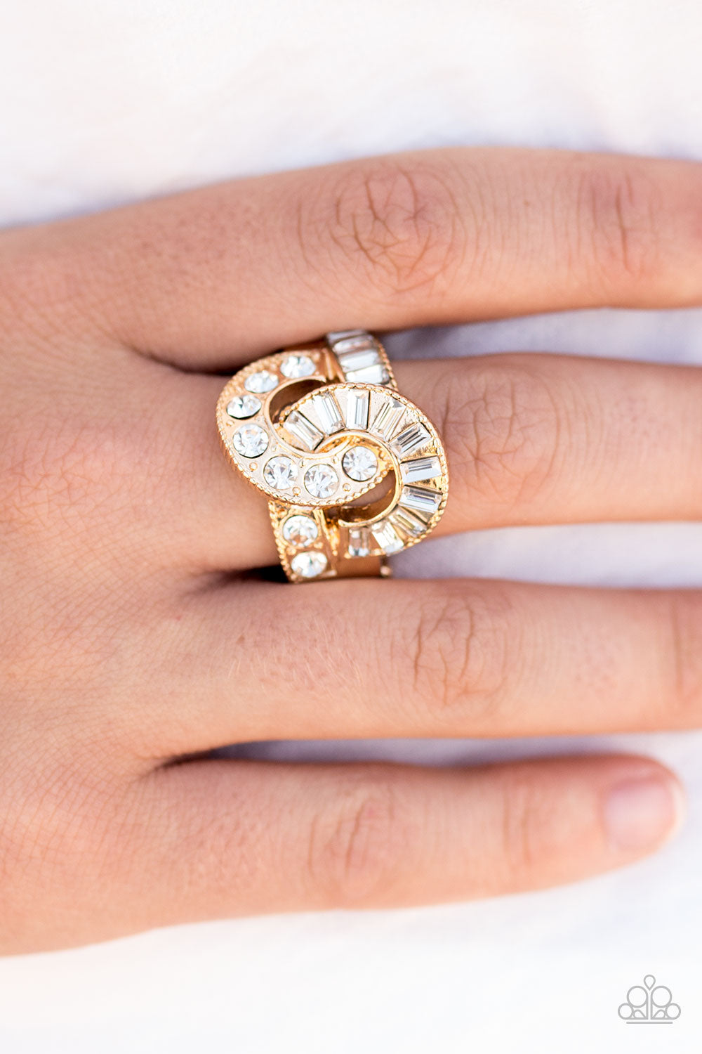 Featuring classic round and emerald style cuts, glittery white rhinestones are sprinkled along interwoven gold ribbons for the ultimate sparkle. Features a stretchy band for a flexible fit.