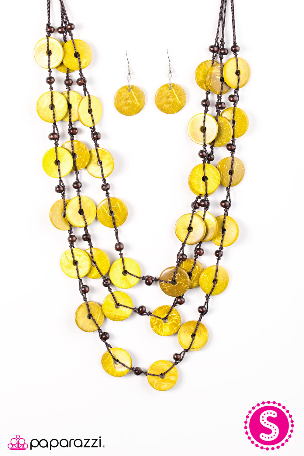 Tinted in yellow finishes, shiny wooden discs trickle along shiny brown cording, creating three colorful layers below the collar. Features a button-loop closure.
