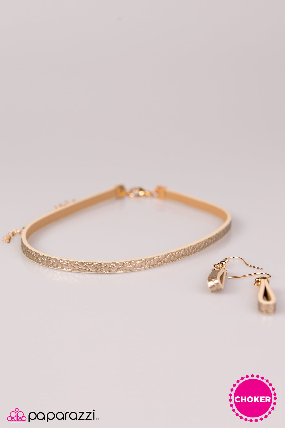 Brushed in a golden shimmer, a textured band of leather wrap around the neck in a gorgeous fashion. Features an adjustable clasp closure.