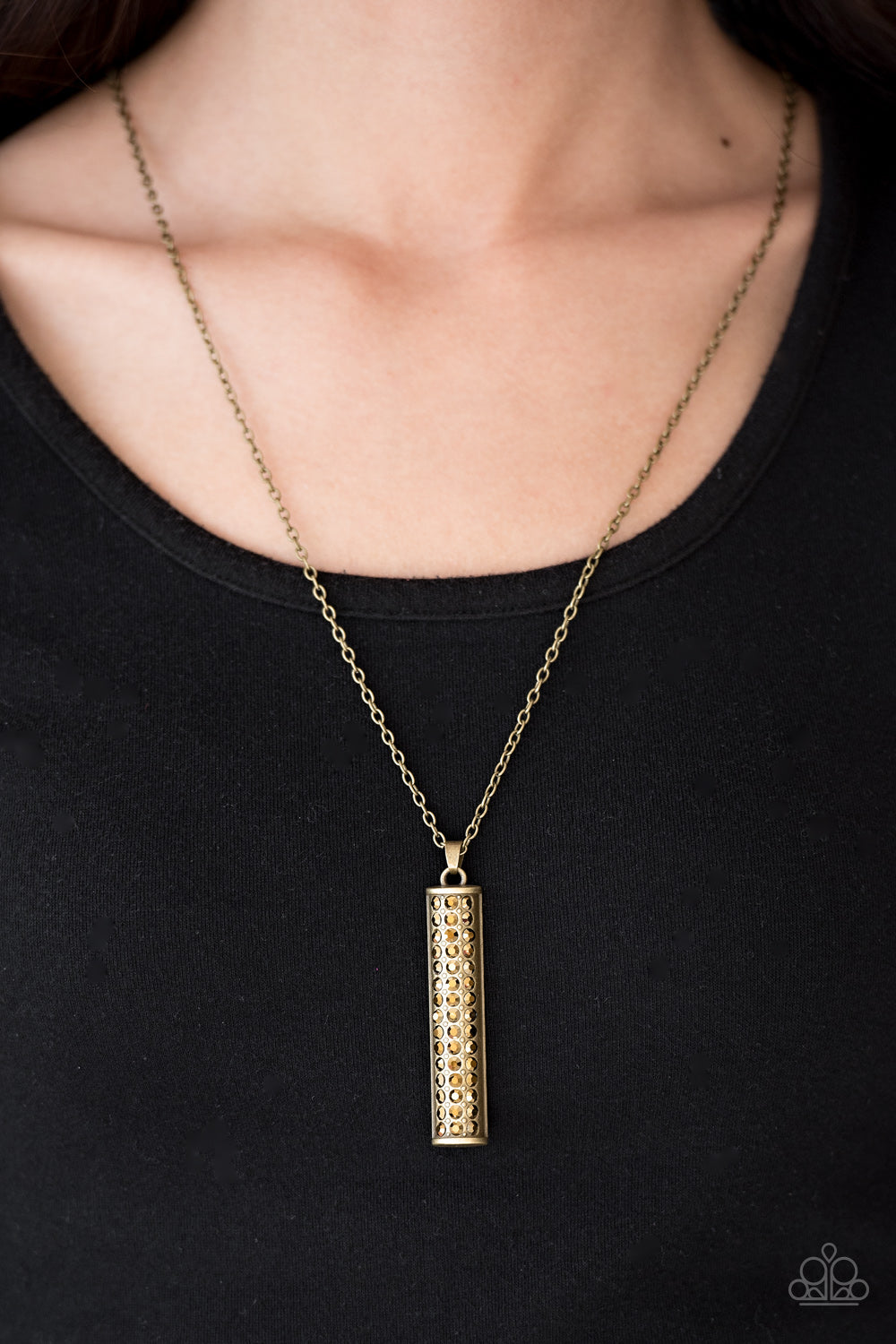 Featuring a rounded edge, a shimmery brass pedant is encrusted in rows of glittery aurum rhinestones for a dramatic look. Features an adjustable clasp closure.
