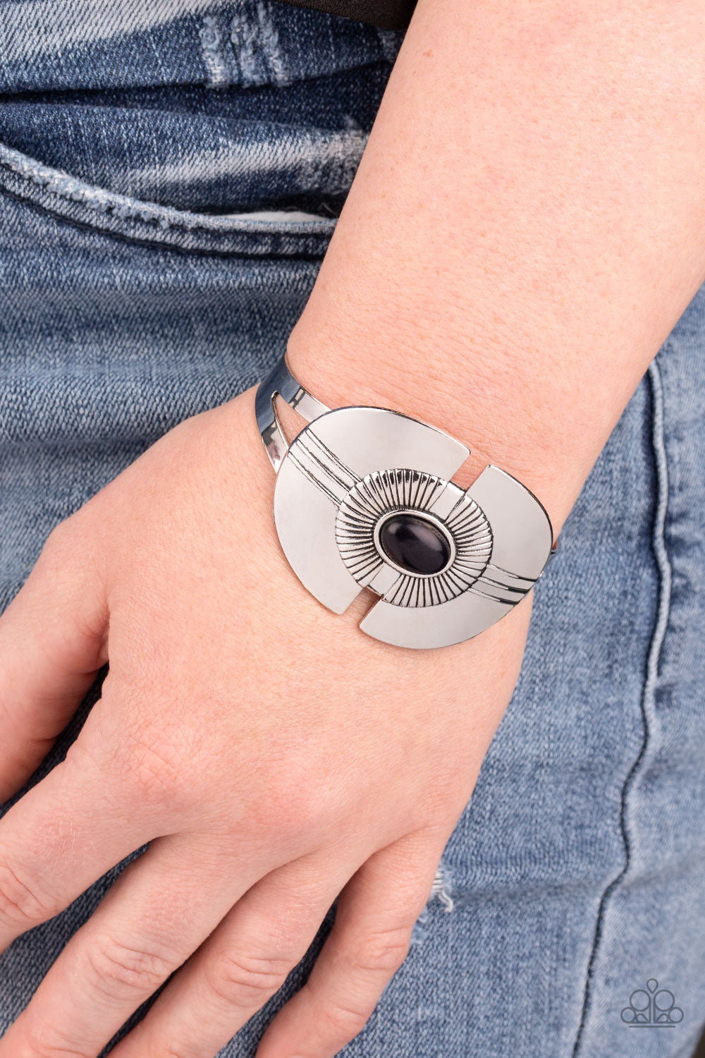Fanning with striking texture, two crescent shaped silver frames are joined together by a smooth black stone atop an airy silver cuff for a statement look.