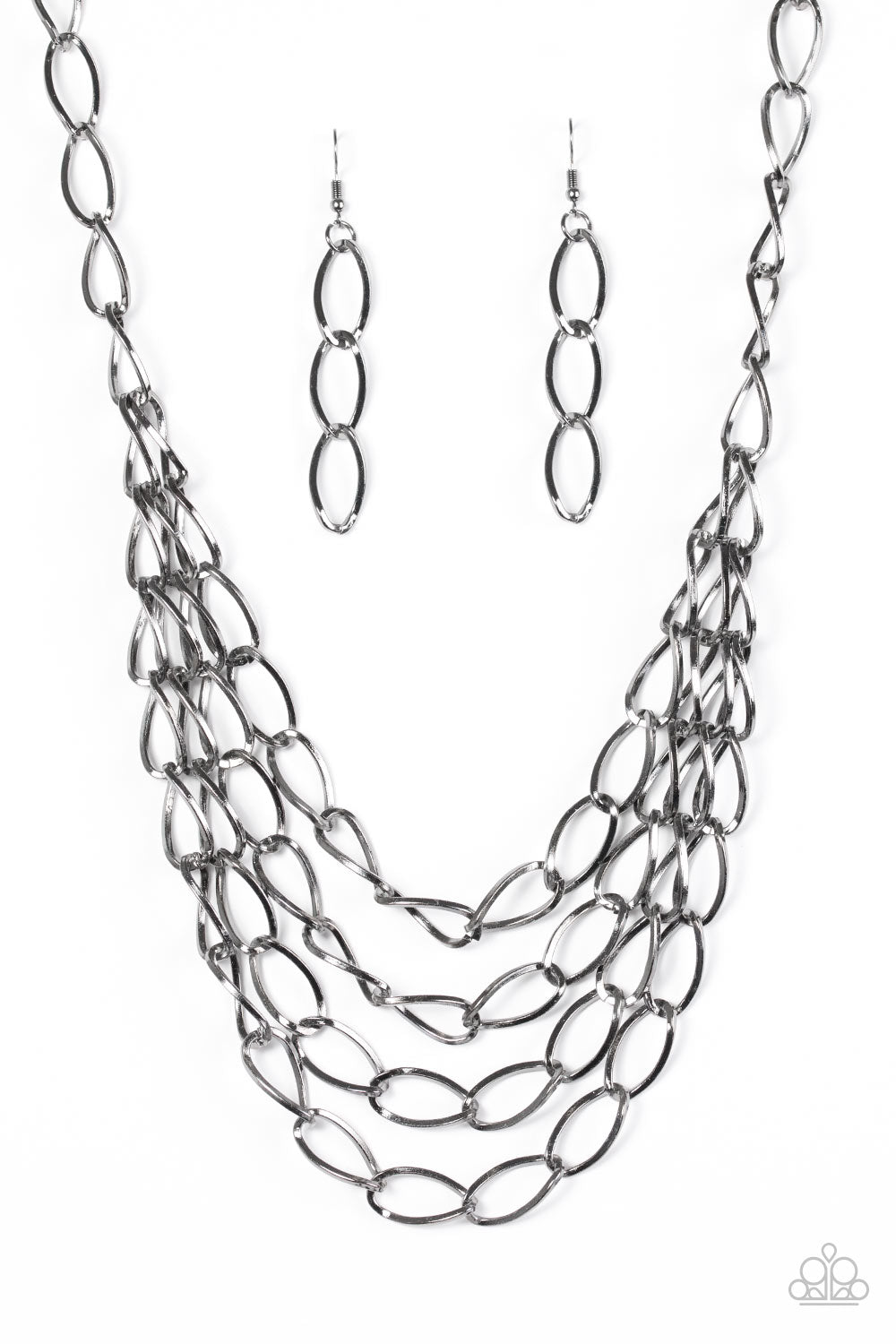 Featuring a subtle twist, glistening gunmetal links join below the collar in four bold layers for a fierce industrial look. Features an adjustable clasp closure.