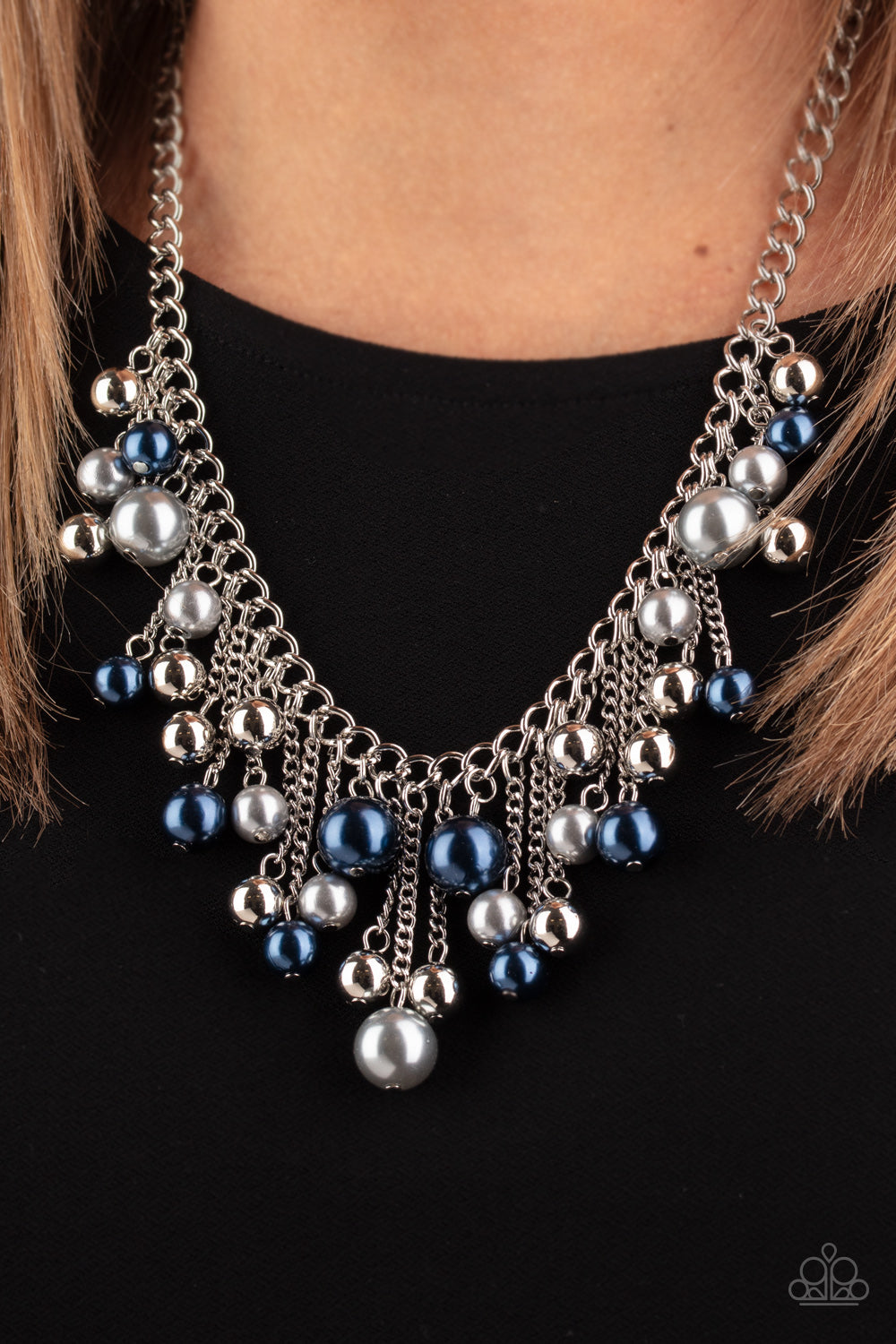 Attached to silver chains, a bubbly collection of blue and gray pearls and shiny silver beads cascade from a thick silver chain, creating a flirtatious fringe below the collar. Features an adjustable clasp closure.