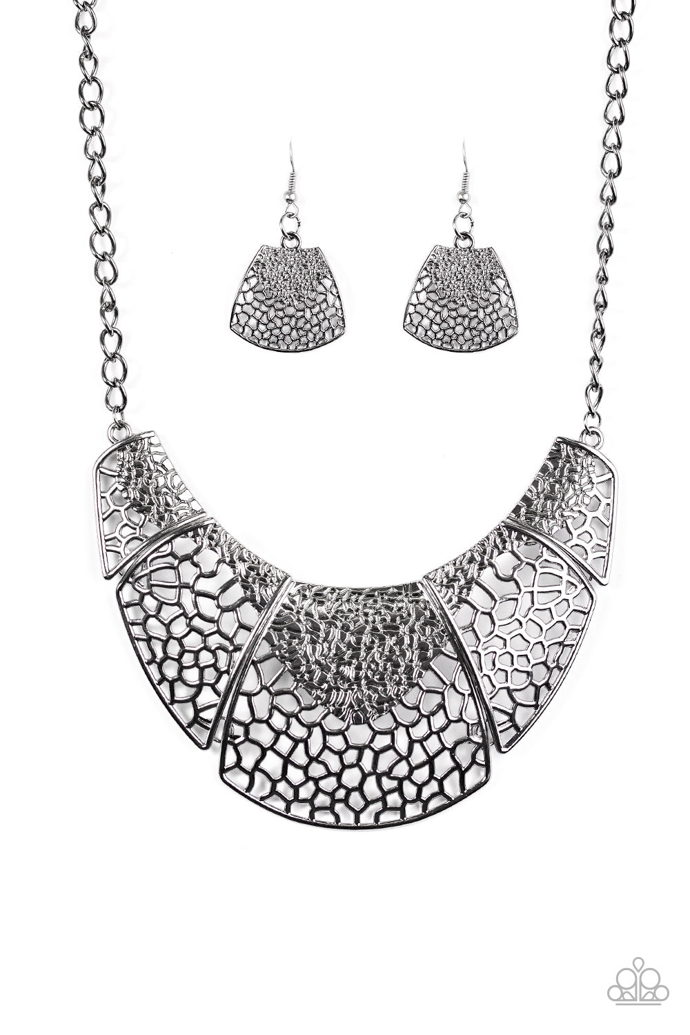 Rippling with metallic texture, shiny gunmetal frames link below the collar. Infused with airy patterns, the dramatic plates connect into a bowing statement piece. Features an adjustable clasp closure.