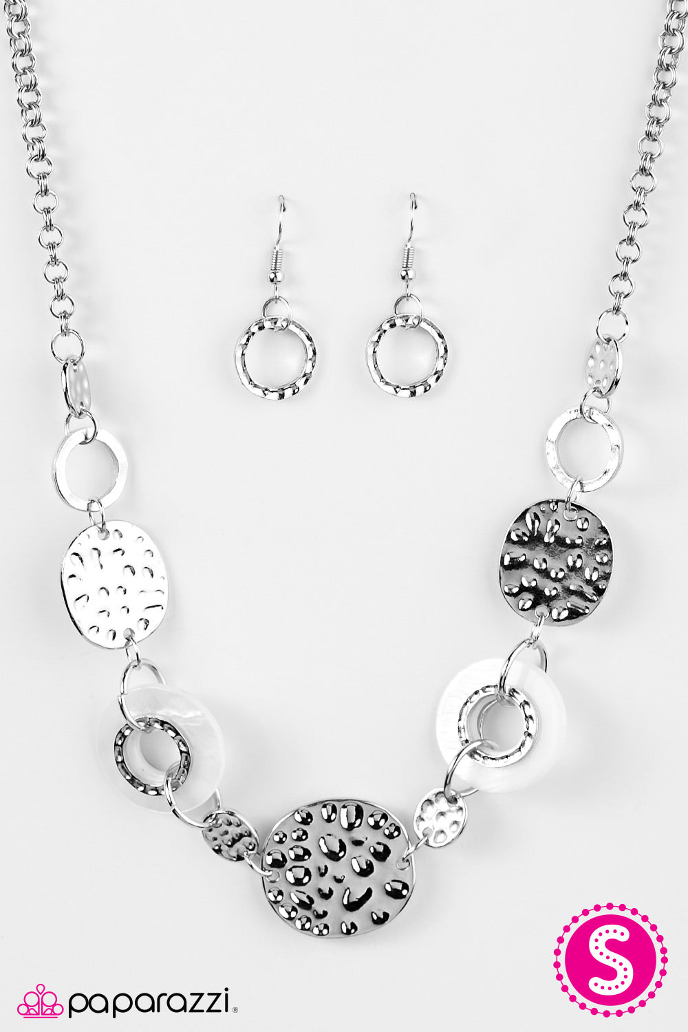 Delicately hammered discs and hoops link below the collar. Brushed in an iridescent finish, white shell-like accents are added to the refined palette for a seasonal finish. Features an adjustable clasp closure.
